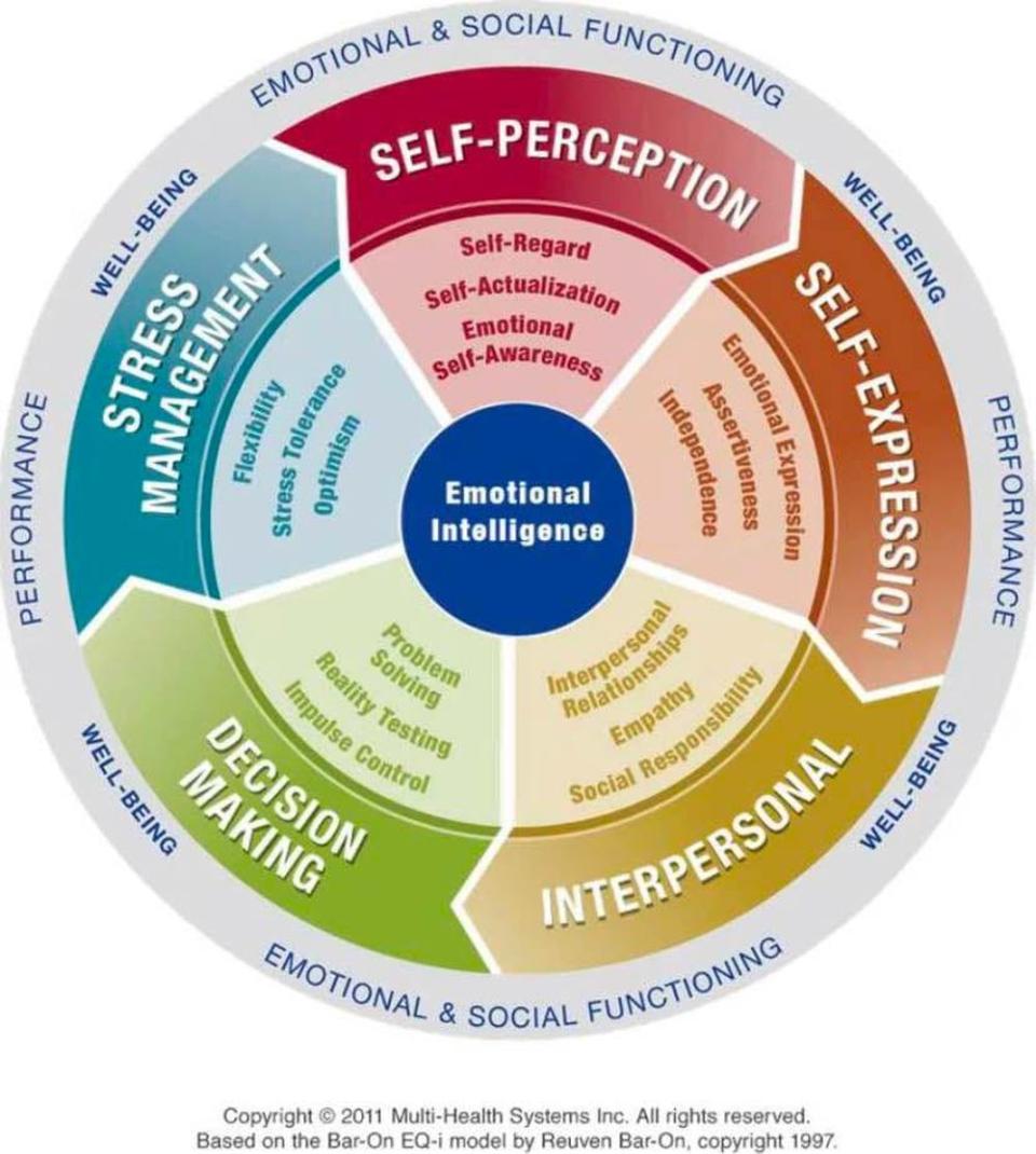 - Себевъзприемане (Self-Perception) – Способността да разпознаваме и разбираме собствените си емоции и как те влияят на нашето поведение и избори. Това включва елементи като себезапазване, емоционално самоосъзнаване и себеактуализация.