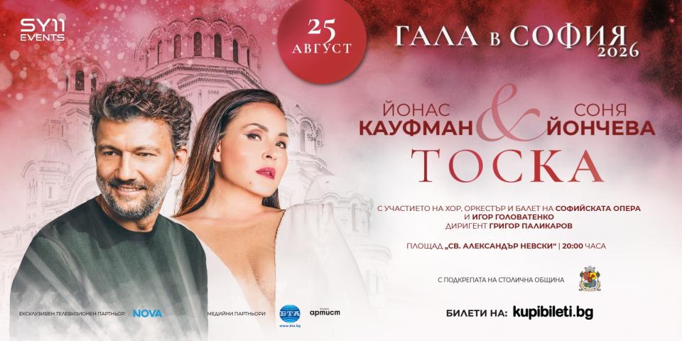 На 25 и 27 август в духовното сърце на българската столица ще се проведе станалата вече емблематична и традиционна „Гала в София” – този път в най-мащабния и най-емоционалния си фестивален формат досега. На грандиозната сцена на площад „Св. Александър Невски” редом до българската оперна прима, продуцент и издател Соня Йончева ще застанат тенор №1 на нашето време Йонас Кауфман и световната сензация в класическата и популярна музика – виолончелистът Степан Хаузер. И двамата са мегазвезди в своите сфери – появата им на тази най-престижна родна сцена е в унисон с мисията на Соня Йончева да превърне България в атрактивна дестинация за изява на най-големите класически артисти на XXI век, от една страна, а от друга – за българската култура да се говори все по-често и с все по-голямо достойнство по света.