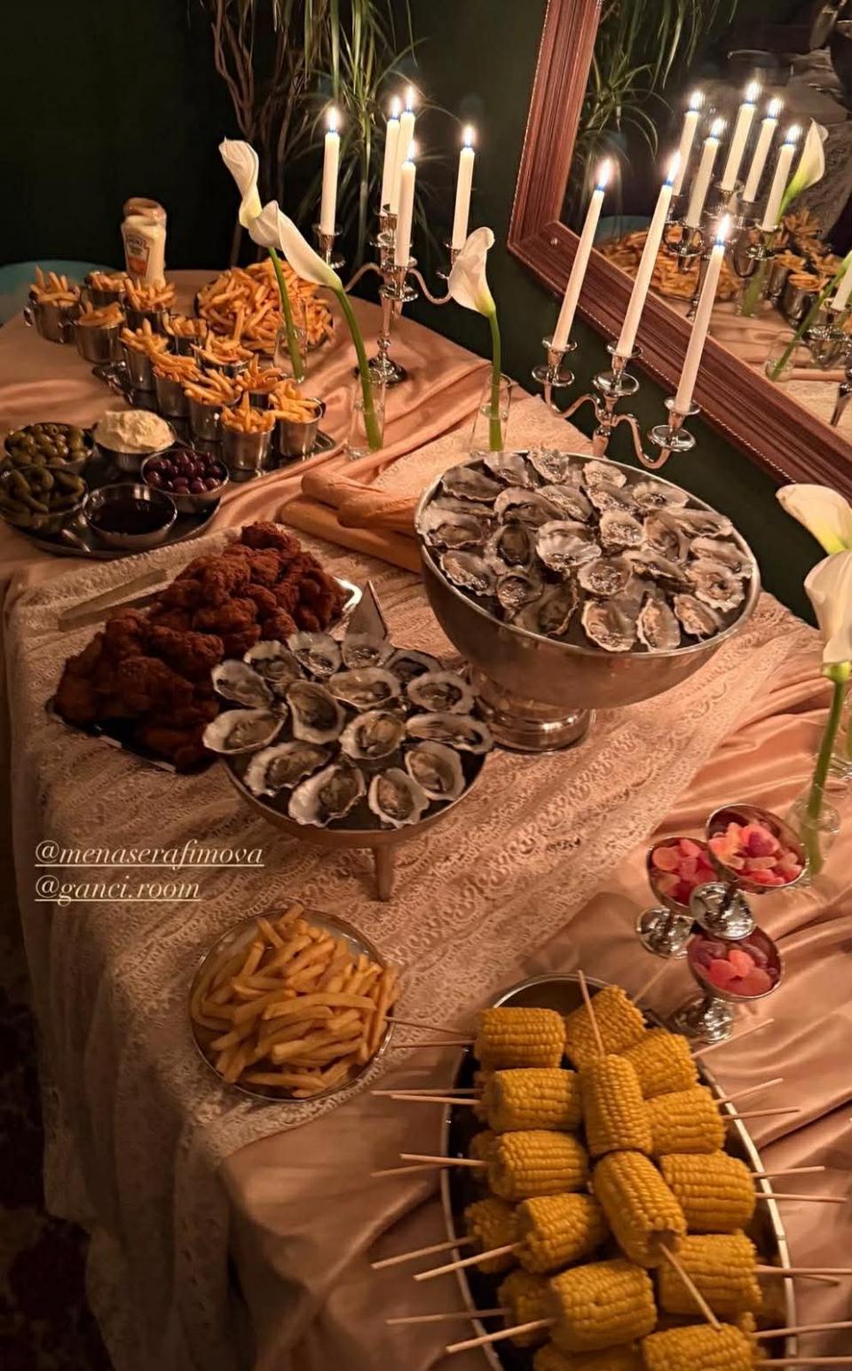 Тортата – на два етажа във властващия за специалния ден бял цвят, бе украсена с малини и златисти свещи. Пищната почерпка е включвала страхотно меню, подбрано от изискани майстор готвачи. Миди, царевица на клечка, месни деликатеси, пържени картофи и неочаквани желирани бонбони се откроиха на част от снимките, споделени в официалните профили на красавицата.