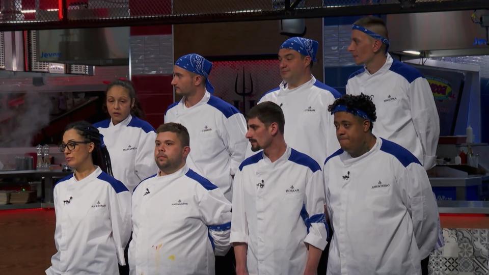 Претендентите в Кухнята на Ада започнаха деня с отборно предизвикателство, което изпита знанията и уменията им с новите пролетни специалитети на шеф Виктор Ангелов. Мъжете завоюваха убедителен успех, който им донесе специална награда – вълнуващо посещение при близките на бразилеца Денисиньо. Колебливото представяне на Червените пък осигури оранжеви престилки за амбициозните Трифонова и Кирил.