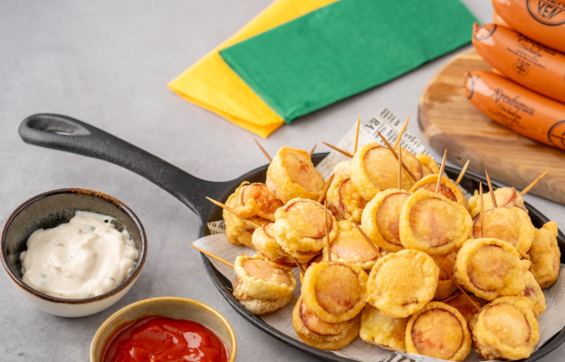 5. С помощта на ринг с диаметър 8 см изрежете 24 кръгчета. Поставете всяко кръгче в гнездото на форма за мъфини с 24 гнезда и го оформете като кошничка. Поставете тавата във фризера за 5 минути.